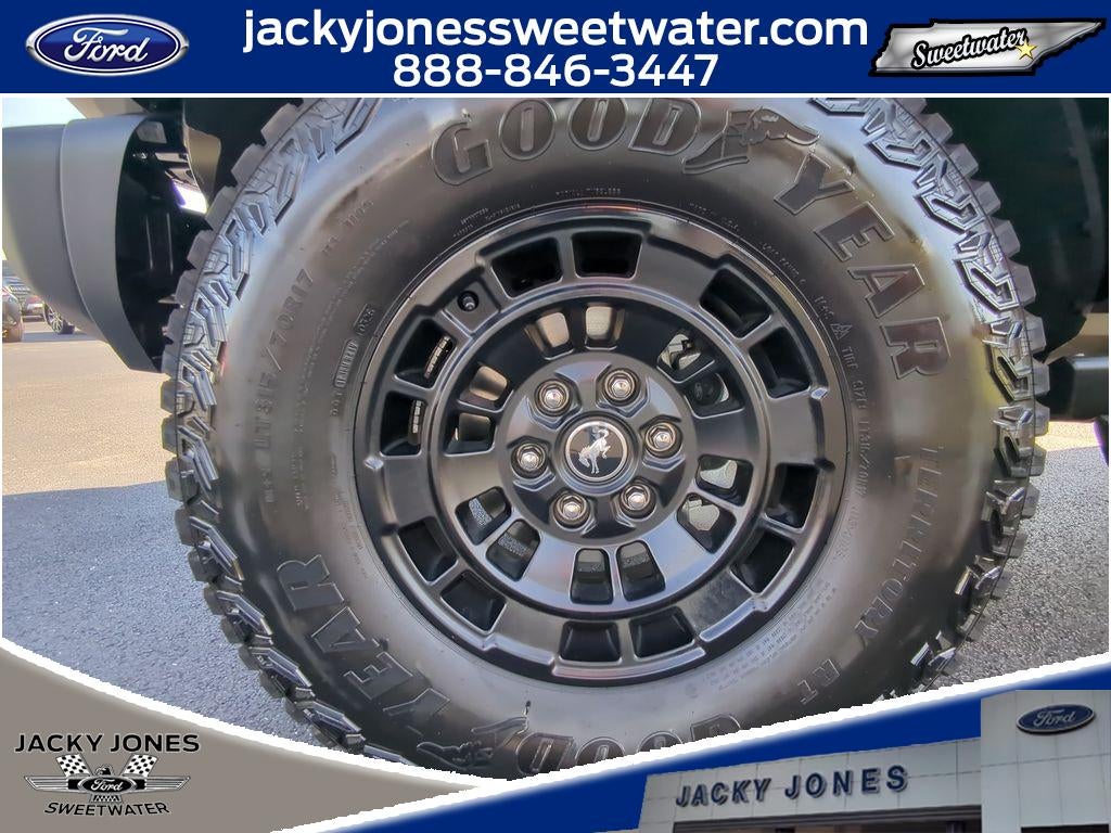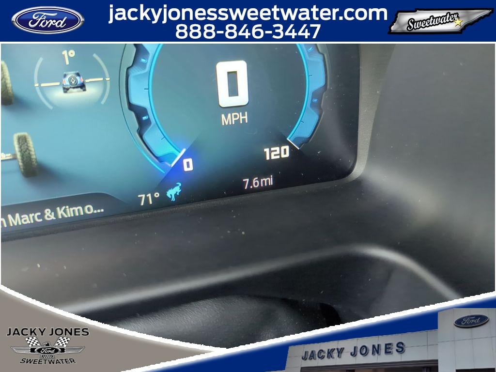 Equipment Group 334A Lux Package: 17" Carbonized Gray-Painted Aluminum Wheel; Rear Parking Sensors; Pro Power Onboard - 400W; Dual Smart Charging USB Ports; 2.3L EcoBoost I-4 Engine; Front Row Heated Seats; Driver and Front Passenger Illuminated Sliding Visor Vanity Mirrors; Evasive Steering Assist; Adaptive Cruise Control; Heated Steering Wheel; Information on Demand Panel; B&O Sound System by Bang and Olufsen; Marine Grade Vinyl Heated Bucket Seats; Dual-Zone Electronic Automatic Temperature Control; Connected Navigation; Front Parking Sensors; 360-Degree Camera; LT285/70R17 Rugged-Terrain R/T Tires; Ambient Footwell Lighting; Remote Start System; 2-Door Intelligent Access with Lock/unlock; Sideview Mirrors. Ford Co-Pilot360: Auto High-Beam Headlamps; Rear View Camera; Pre-Collision Assist with Automatic Emergency Braking; Blind Spot Information System (BLIS); Lane-Keeping System. Sasquatch Package: High Clearance Suspension; Front Stabilizer Disconnect; Position-Sensitive Bilstein Shock Absorbers. Front Stabilizer Disconnect. Shadow Black-Painted Hard Top. Raptor-Style Running Board. Marsh Gray. **Equipment listed is based on original vehicle build and subject to change. Please confirm the accuracy of the included equipment by calling the dealer prior to purchase.**