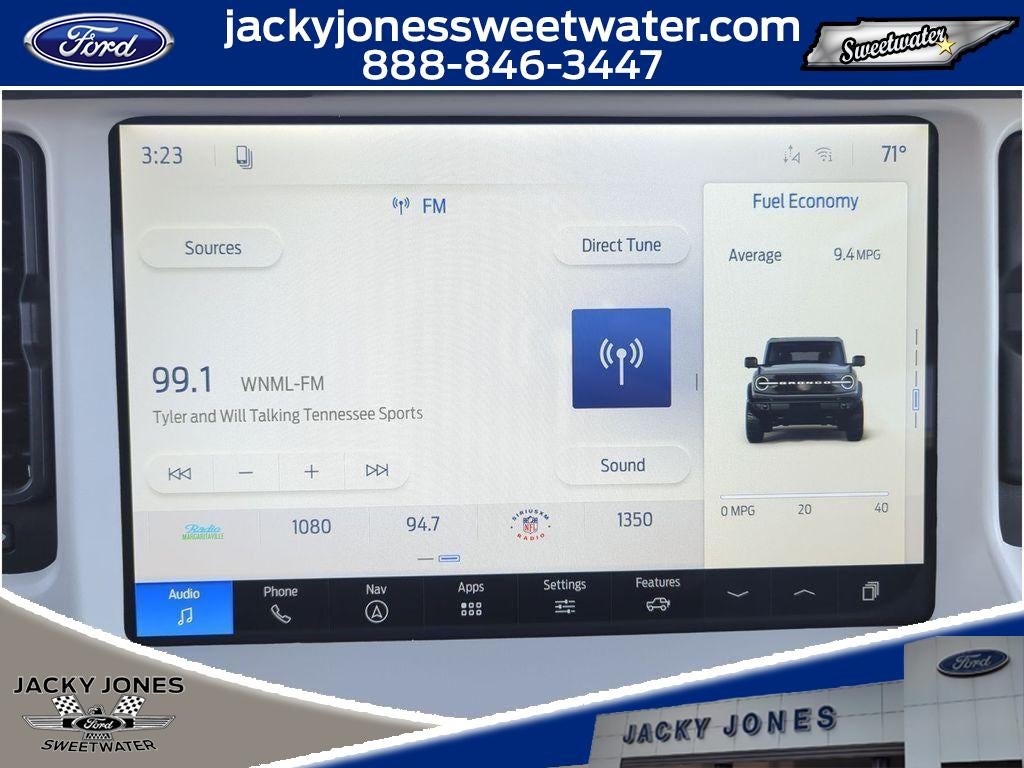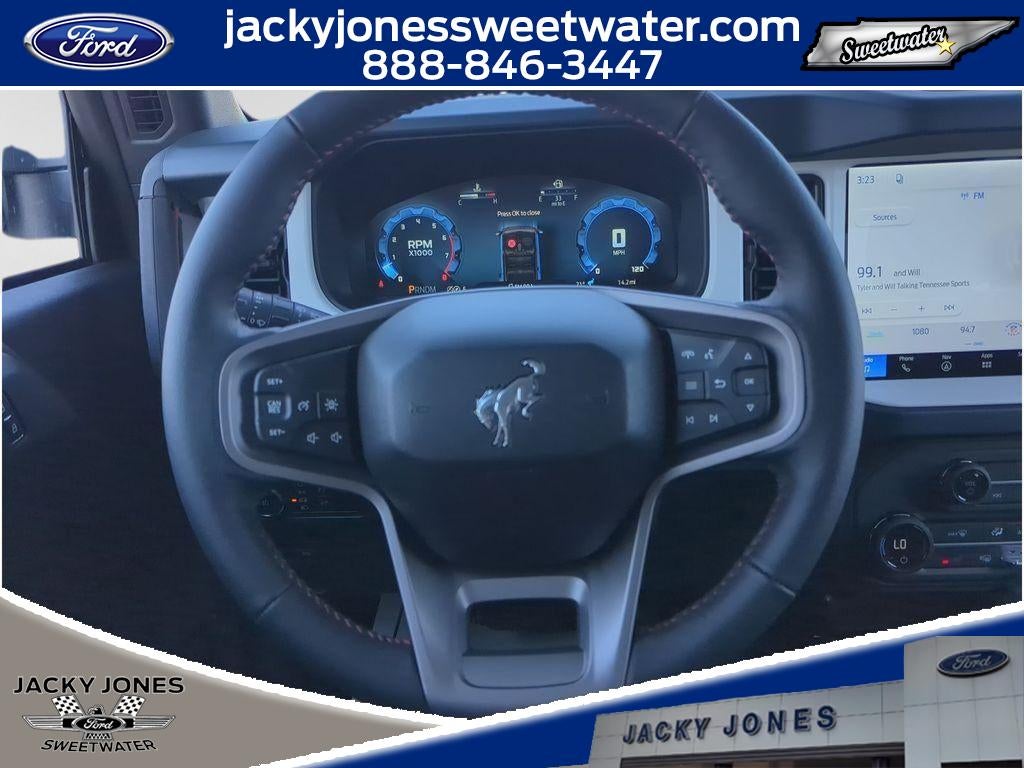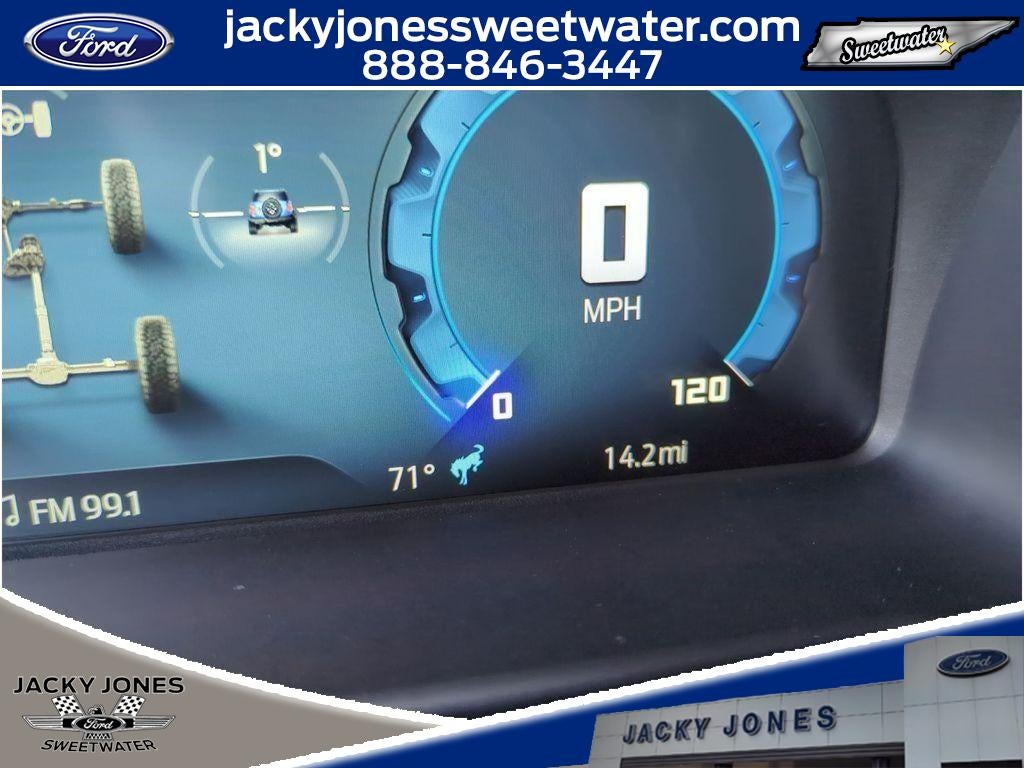 The installed navigation system will keep you on the right path. This 1/2 ton suv offers Apple CarPlay for seamless connectivity. Protect this model from unwanted accidents with a cutting edge backup camera system. Never get into a cold vehicle again with the remote start feature on this unit. Keep your hands warm all winter with a heated steering wheel in this Ford Bronco . This model offers Android Auto for seamless smartphone integration. It features a hands-free Bluetooth® phone system. This unit's Cross-Traffic Alert: Safeguarding you from unexpected traffic when reversing. An off-road package is equipped on this model. Conquer any rainy, snowy, or icy road conditions this winter with the all wheel drive system on the Ford Bronco. This Ford Bronco emanates grace with its stylish gray exterior. This unit has a V6, 2.7L high output engine. Maintaining a stable interior temperature in this Ford Bronco is easy with the climate control system.