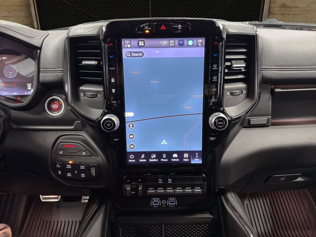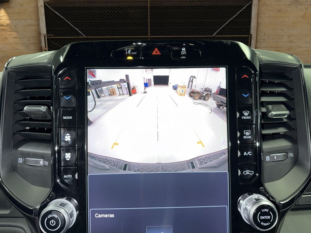 The Ram 1500's Forward Collision Warning feature alerts drivers to potential front-end collisions. This vehicle offers Android Auto for seamless smartphone integration. Protect this vehicle from unwanted accidents with a cutting edge backup camera system. The vehicle is pure luxury with a heated steering wheel. It offers Apple CarPlay for seamless connectivity. This model features a hands-free Bluetooth® phone system. You'll never again be lost in a crowded city or a country region with the navigation system on it. An off-road package is equipped on this model. Never get into a cold vehicle again with the remote start feature on this vehicle. This vehicle has auto-adjust speed for safe following. The leather seats in it are a must for buyers looking for comfort, durability, and style. When you encounter slick or muddy roads, you can engage the four wheel drive on the Ram 1500 and drive with confidence. The vehicle has a 6 Cyl, 3.0L high output engine.